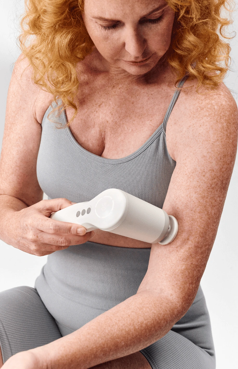 Im nächsten Schritt behandelst du den Bizeps und die Beugemuskulatur des Unterarms. Fahre dazu mit dem Telleraufsatz flächig über beide Bereiche. Verwende die 50-Hz-Frequenz und wähle eine Intensität, die sich für dich angenehm anfühlt. Anschließend aktivierst du den Trizeps und die Streckmuskulatur des Unterarms. Nutze dafür die 75- oder 100-Hz-Frequenz und streiche die Bereiche jeweils von unten nach oben flächig aus.
