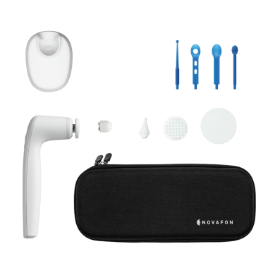 Zur Reinigung trennen Sie das Gerät vom Stromkreislauf. Bei privatem Gebrauch verwenden Sie zur Reinigung des Gerätegehäuses und der Aufsatzelemente ein sauberes, mit klarem Wasser oder einer milden Seifenlauge befeuchtetes Tuch. Für den klinischen und professionellen Gebrauch reinigen und desinfizieren Sie Gerätegehäuse, Telleraufsatz und Kugelaufsatz mit einem entsprechenden Oberflächendesinfektionsmittel für Medizingeräte vor und nach jeder Anwendung. Generell empfiehlt NOVAFON zur Desinfektion alkoholfreie Desinfektionsmittel, wie z.B. SinAlc sensitiv von HIMED oder RHEOSEPT-WD plus Wipes von Rheosol, die sich für den Einsatz bei empfindlichen Oberflächen eignen um das Gerätegehäuse nicht zu beschädigen. Wischen Sie ggf. mit einem weichen Tuch trocken nach.